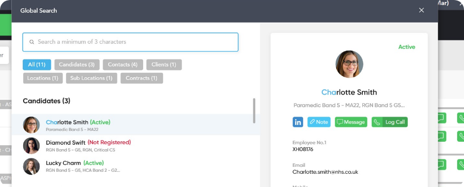 Navigating between menu’s is a thing of the past. With the new Global Search feature, your team gets instant access to candidates, clients, contacts, and contracts - all from one streamlined search panel. Just click the magnifying glass icon in the top-right corner to get started.