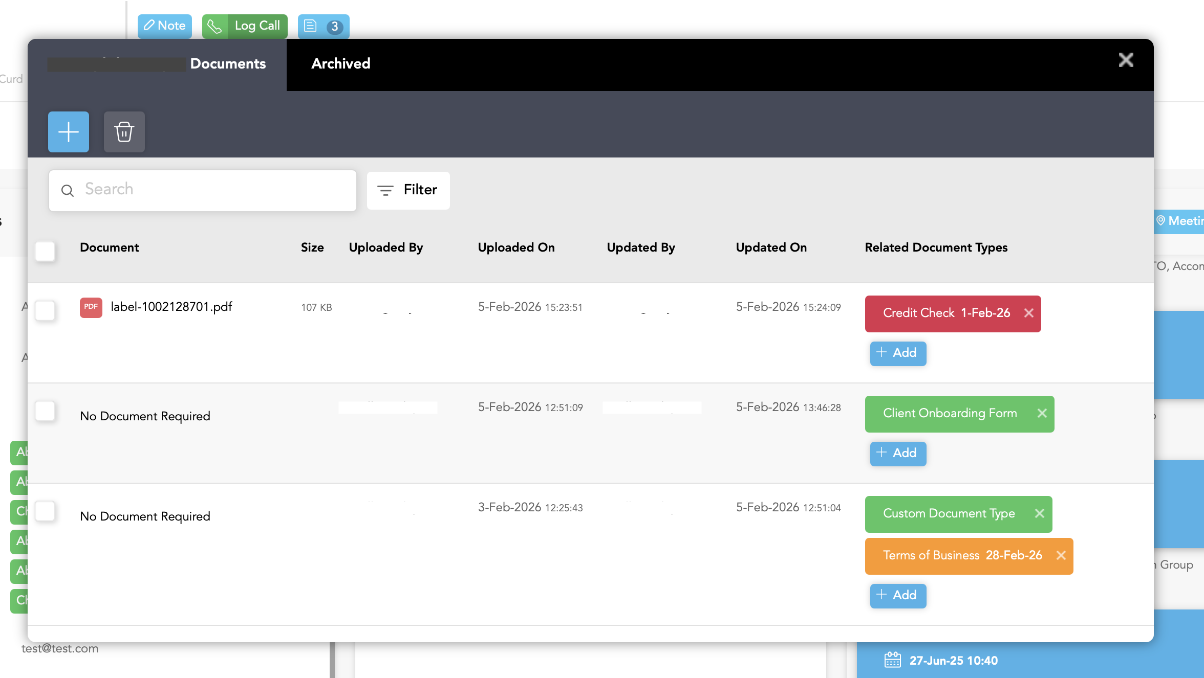 Client front-end records now include a full Document Library, bringing document management in line with the Candidate experience. Users can upload, organise and archive client documents with structured document types and consistent filtering.