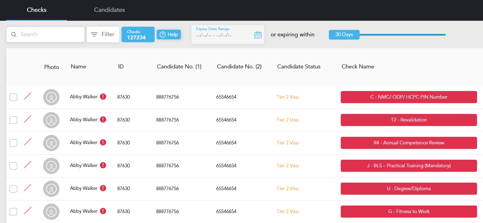 The screen defaults to Checks and opens with a 30-day expiry slider, immediately surfacing expired, missing and upcoming checks. Users can switch between an expiry date range or slider view to quickly focus on relevant time windows.