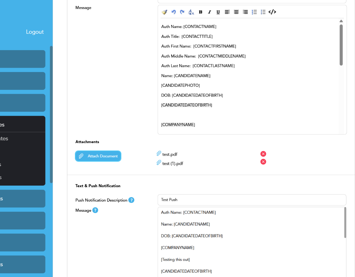 Message templates now support document attachments that automatically populate in emails. Users can review or remove attachments before sending.