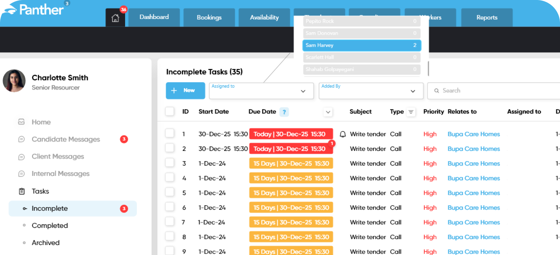 Users can create detailed tasks with type, priority, start and due dates, reminders, notes and attachments, and tag them to candidates, clients, locations, contracts, contacts, internal users and compliance checks. Tasks can be assigned to one or more users, making it easy to delegate work and collaborate across teams. The system ships with a set of default task types - including Note, Call, Meeting, Message, Email, Interview, Training and Compliance - while still allowing Panther users to add their own task types.