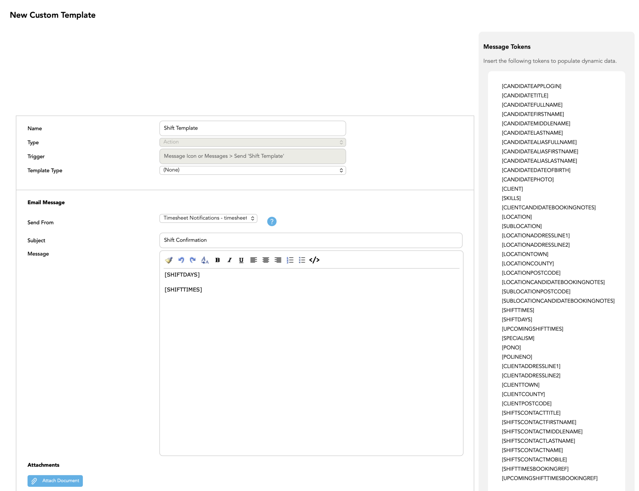 A new [SHIFTDAYS] token displays shift dates only, while the existing [SHIFTTIMES] token shows both dates and times. This gives users a cleaner option when they want to communicate schedules without including time details.