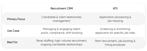 While both CRM and ATS help manage candidates, the key difference lies in their scope. An ATS focuses mainly on tracking applications, managing resumes, and streamlining the hiring process. An ATS is essential for tracking candidates through the interview and selection stages.